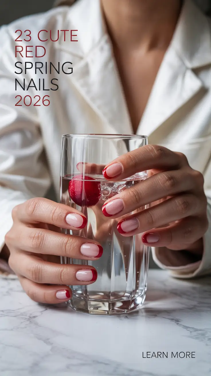 Sometimes the simplest red spring nails end up being the most elegant. This manicure takes the classic French tip and refreshes it with a bold red edge instead of the traditional white. The nails are shaped into a neat short square acrylic style, and the soft pink base keeps everything looking fresh and polished.