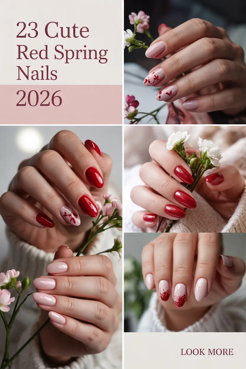 Cute red spring nails in 2026 are surprisingly versatile. Think glossy cherry tones, delicate white art, soft pink bases, and modern French tips that feel fresh instead of classic. Some designs are bold, others simple – but all of them bring a little energy to your everyday look.