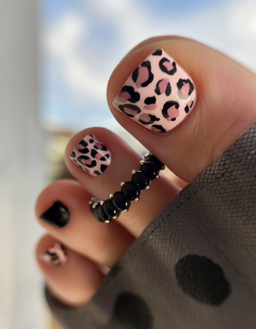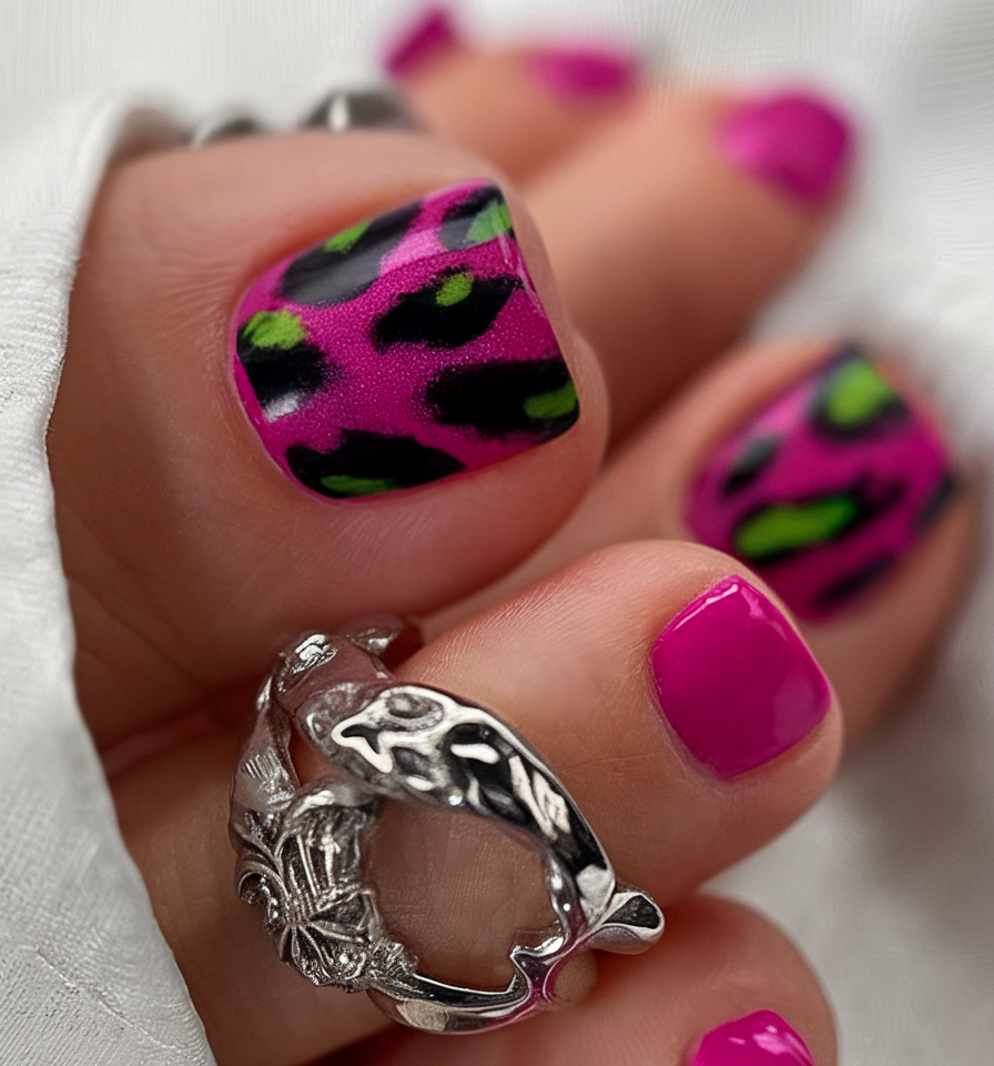 This vibrant spring toe nail idea 2025 features a bold pink base with neon green and black leopard print accents. The colors trend creates an electrifying and daring look, perfect for those who love bold fashion choices. The high-gloss gel polish for this pedicure enhances the vibrancy and adds a luxurious shine. A standout design for anyone looking to make a fierce and confident color combo.