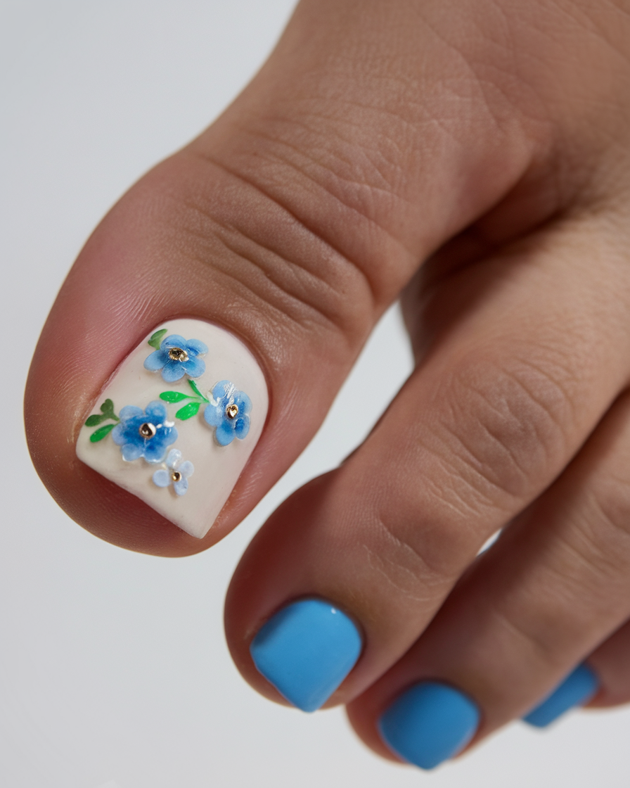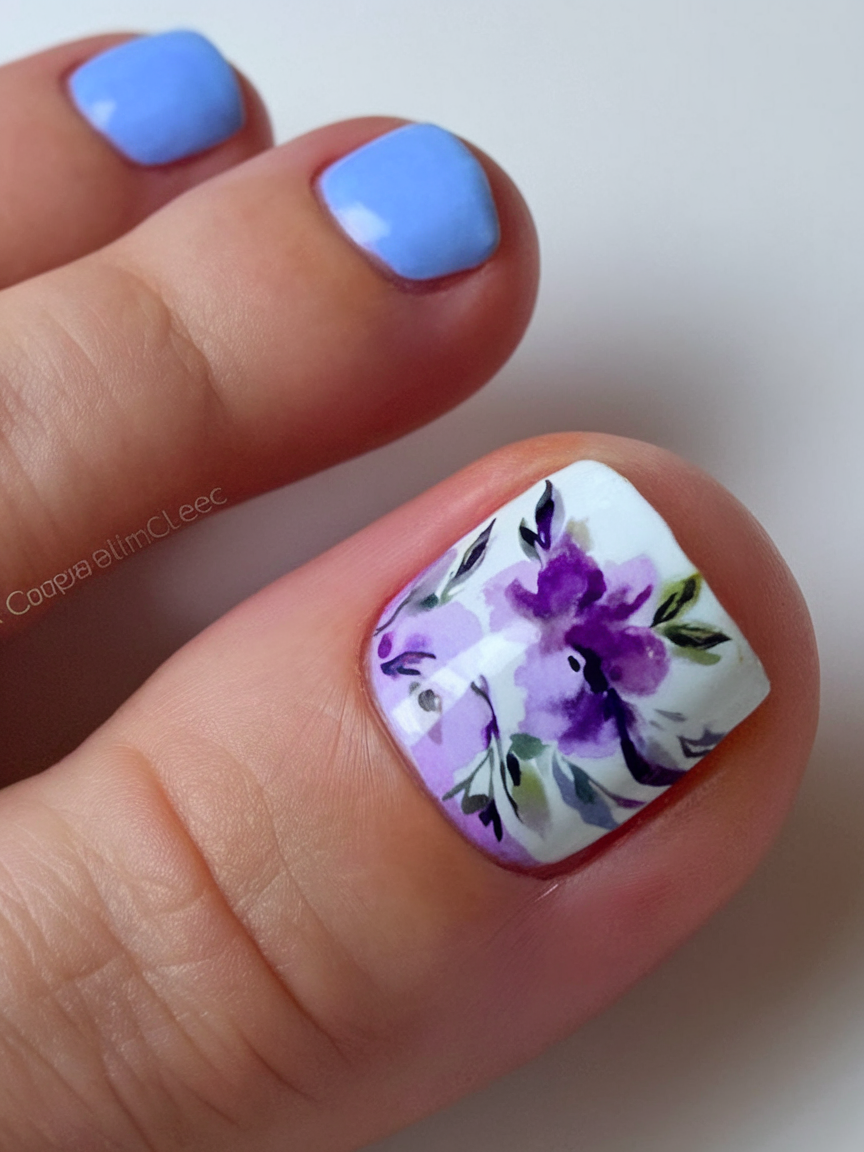 This dreamy colors trend features a neutral base with soft watercolor floral accents. The hand-painted design in purple and green adds a fresh and artistic vibe, making it a must-try for spring pedicures. The sky-blue polish complements the floral art, creating a serene and feminine matching effect. Perfect for those who love intricate yet elegant polish for the season.