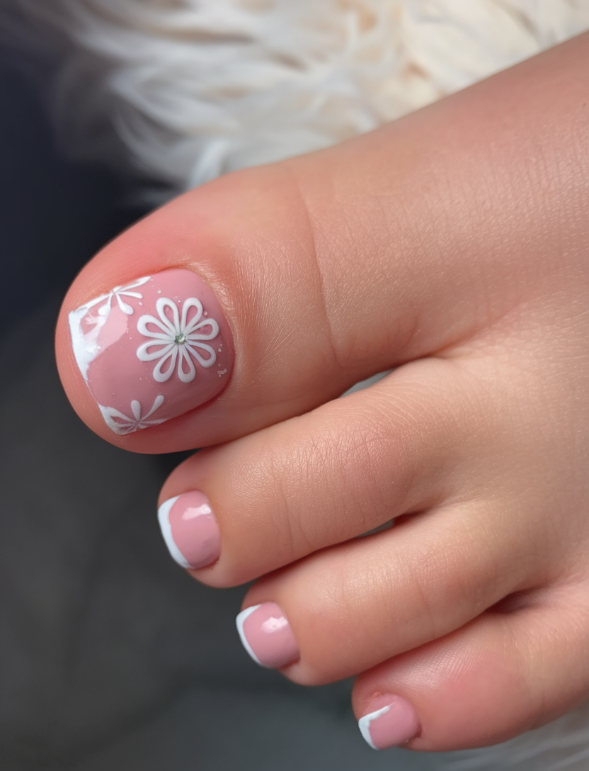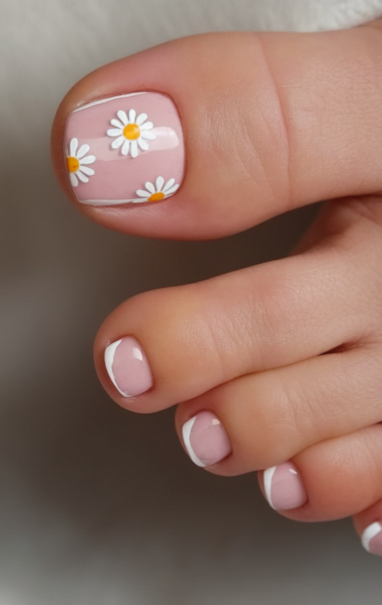 This delicate spring toe nail idea 2025 blends soft pink with hand-painted daisy details. The tiny white flowers add a fresh and feminine touch, creating a perfect color trend for the season. The subtle French tip detail enhances the neutral base, making it both classic and playful. This color combo is a great way to bring a touch of nature to your pedicures.