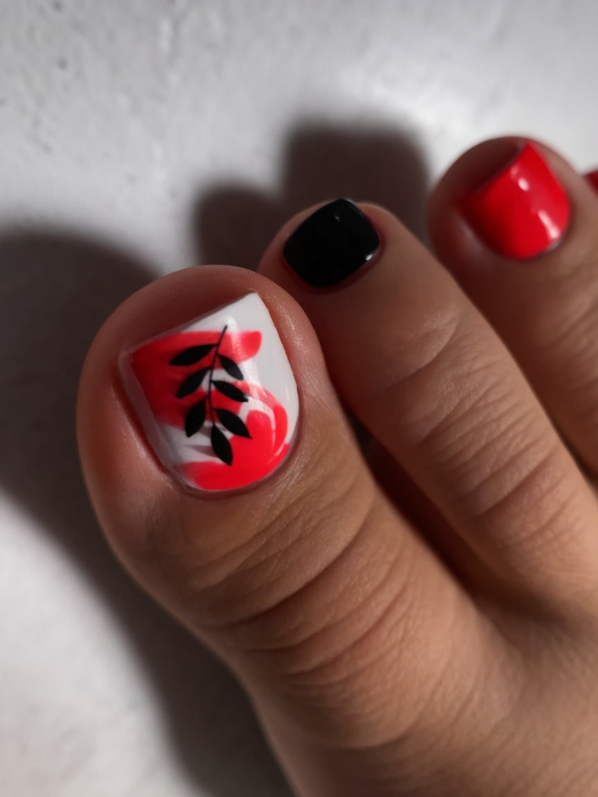This trendy pedicure combines fiery red, deep black, and crisp white in a striking abstract pattern. The leaf detail adds a sophisticated edge, making it a unique design for spring toe nail ideas 2025. The high-contrast color combo is perfect for those who love artistic and statement-making polish colors. A daring choice that pairs well with both neutral and bold outfits.