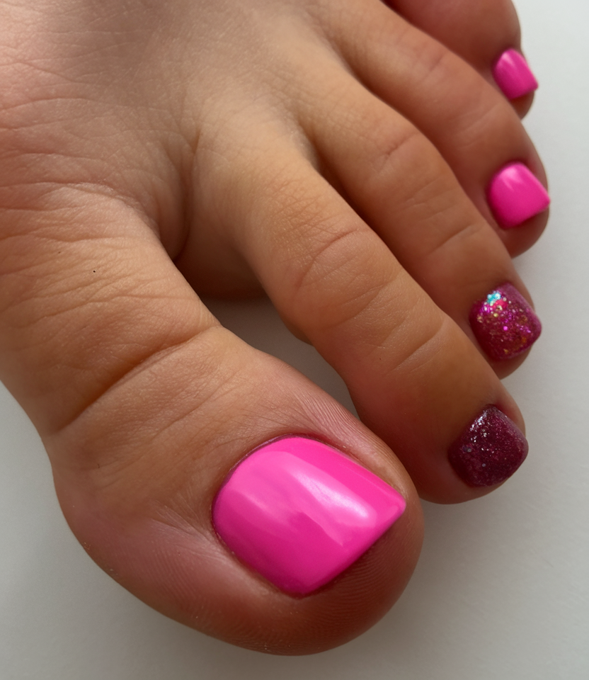 A mix of colors pedicures 2025, this look features vibrant pink with a dazzling glitter accent. The gel polish for this pedicure ensures a long-lasting shine and bold color impact. The combination of glossy and glittery finishes makes this color combo fun, youthful, and perfect for spring. A great option for those who love bright and eye-catching polish colors.