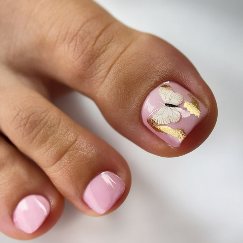 A delicate and feminine polish for spring, this soft pink pedicure features a detailed butterfly design with elegant gold foil accents. The shimmering details add sophistication, making it a great option for special occasions. This color combo blends classic and artistic elements, making it both timeless and modern. A perfect choice for those who love intricate yet graceful pedicures.