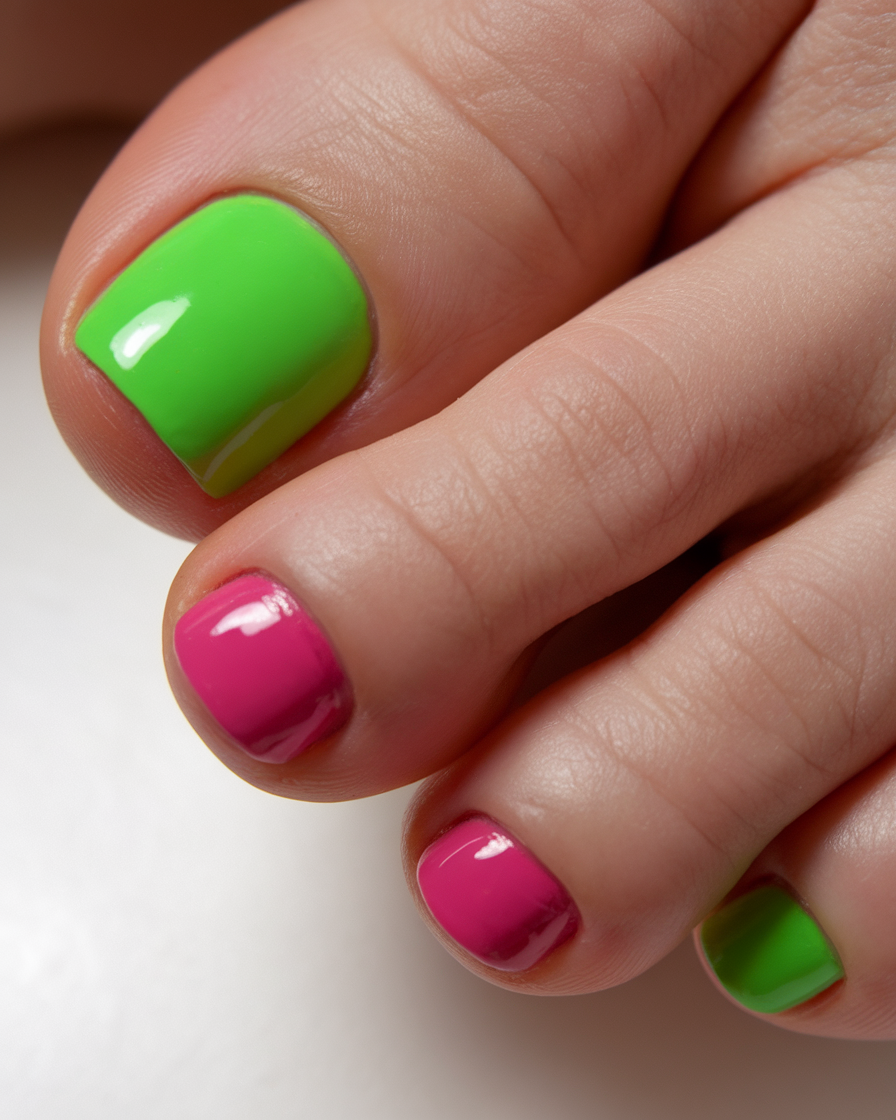 This trendy pedicure combines neon green and vibrant pink in a fun, high-contrast color combo. The glossy finish enhances the brightness of the polish colors, making it a standout choice for spring toe nail ideas 2025. Ideal for those who love daring and playful colors trends, this pedicure adds energy to any look. A perfect match for vibrant summer outfits and statement accessories.