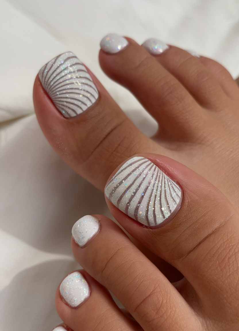 This shimmering gel polish for pedicures features a stunning shell-inspired design with fine glitter accents. The delicate curves add a luxurious texture, making it a perfect colors trend for those who love elegance with a touch of glam. The soft white and iridescent effect create a beach-ready color combo, ideal for vacation or special occasions. A must-try design for lovers of subtle yet captivating polish colors.