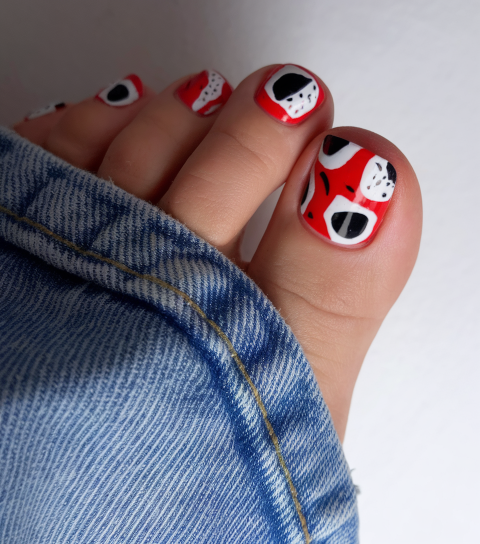 This trendy pedicure features a vibrant red base with unique black and white abstract accents. The high-contrast color combo creates a modern and eye-catching design, perfect for those who love bold colors pedicures 2025. The geometric patterns add an artistic touch, making this a standout polish for the season. A great choice for those looking to make a confident and edgy style statement.