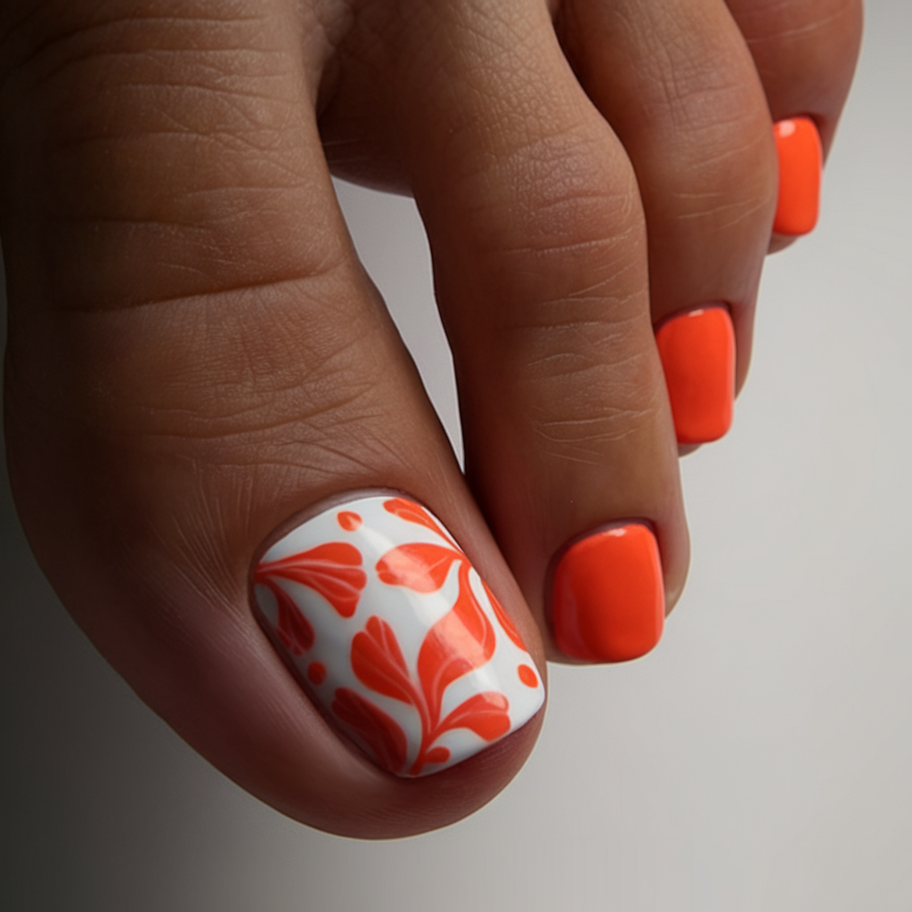 A fresh and vibrant colors trend, this pedicure combines bold orange with delicate white floral patterns. The swirled design adds a soft and artistic contrast to the bright base, making it perfect for spring pedicures. This color combo is both energetic and elegant, making it a great option for vacations or everyday wear. A stylish polish for those who love intricate yet playful polish colors.