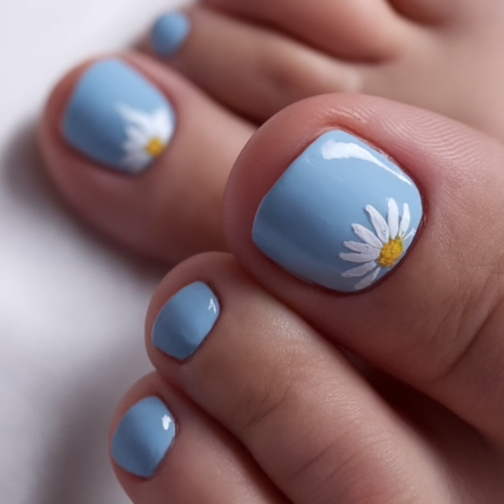 This delicate spring toe nail idea 2025 features a calming blue shade with hand-painted daisy accents. The color trend embraces a light, airy feel, making it a perfect choice for warm-weather outfits. The floral detail adds a feminine touch while keeping the pedicure simple yet stylish. A beautiful matching option for those who love fresh, nature-inspired polish colors.