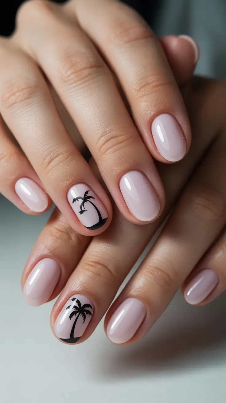 To recreate this look, I usually reach for a translucent pink gel like OPI Bubble Bath or Essie Ballet Slippers as a base. A fine nail art brush and highly pigmented black gel paint are essential for the palm detail. A glossy top coat – preferably Seche Vite or CND Shellac Top Coat – keeps the finish glassy and vacation-proof.