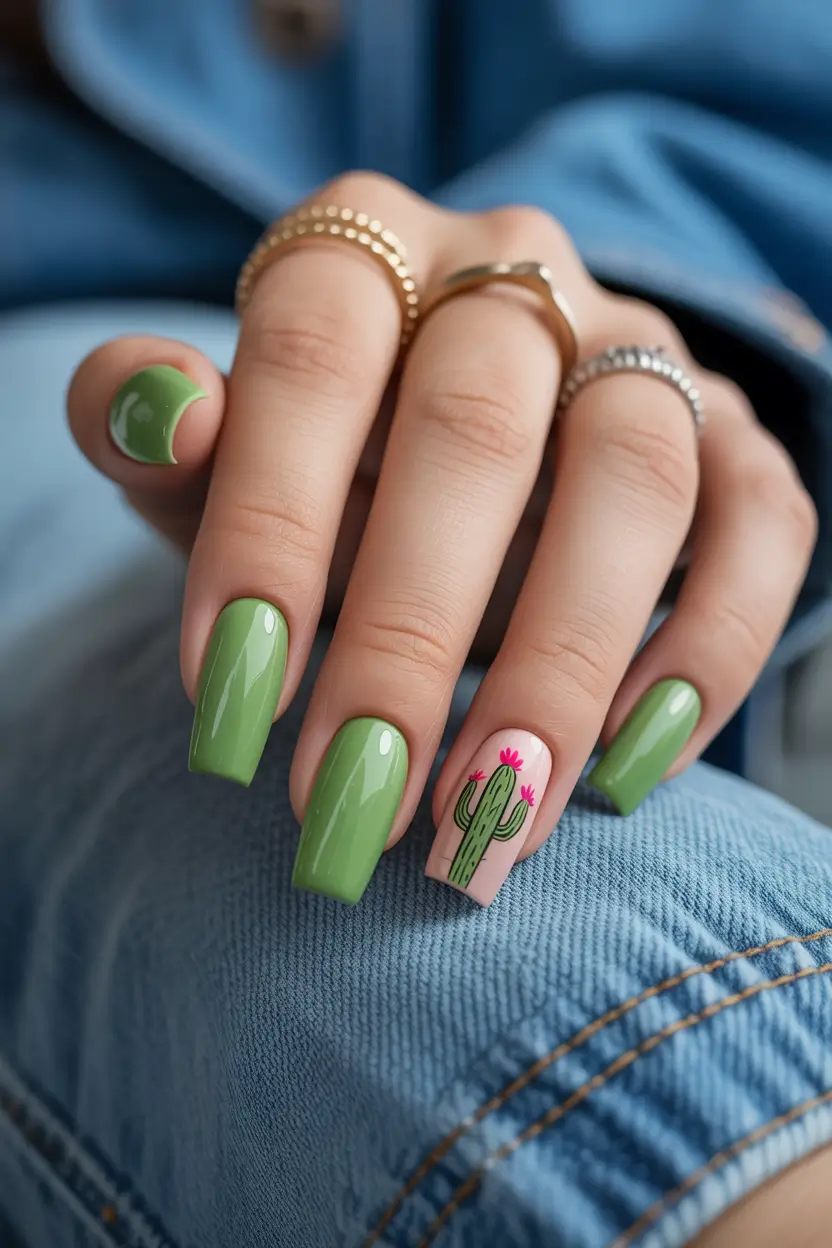 Ending on something fun feels right. These square long nails use a juicy green shade paired with a single cactus illustration that adds personality without overwhelming the manicure. The glossy finish keeps it modern while the playful accent gives strong vacation inspo energy – cheerful, bright, and relaxed.