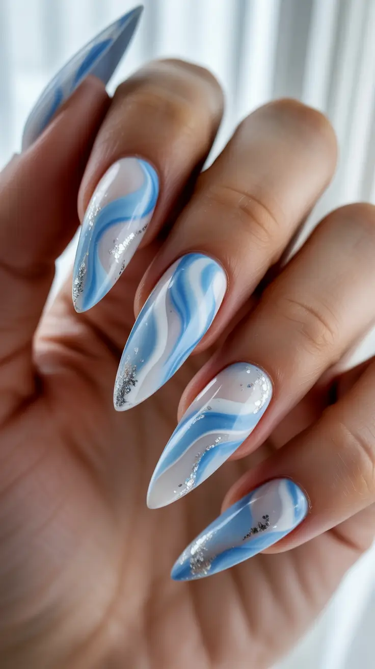 Soft Blue Marble Almond Nails with Ocean Shine