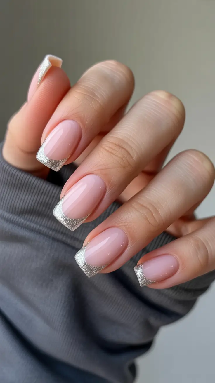 I usually choose a sheer blush gel like OPI Put It In Neutral and apply glitter gel with a thin angled brush to shape the tips evenly. Nail artists often say metallic edges instantly elevate minimal manicures, and this design proves it.