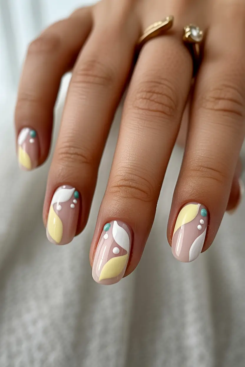 These short nails lean into soft abstract color blocking using creamy nude, white, pastel yellow, and tiny mint accents. The shapes feel organic and relaxed, almost like modern art translated into manicure form. It is cute, fresh, and ideal for anyone who wants subtle color without committing to bright tones.