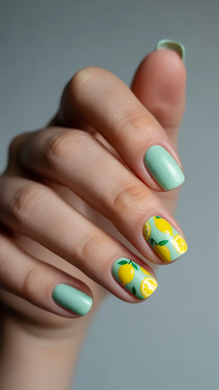 Ending on something cheerful feels right for spring travel energy. Short rounded nails combine a soft mint base with tiny lemon illustrations that instantly add brightness. The design feels fun, youthful, and effortlessly seasonal, like sunshine translated into nail art.