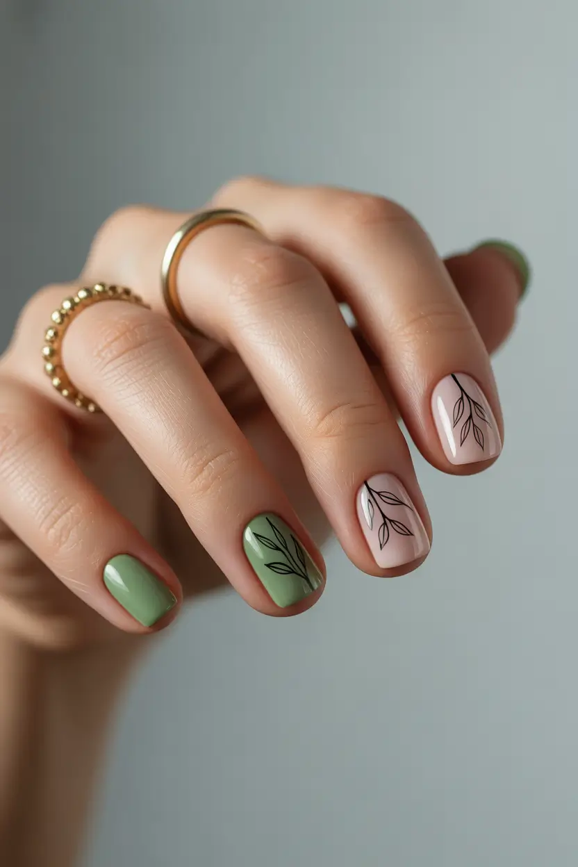 To recreate this look, I usually reach for OPI Sage Simulation or Essie Win Me Over for that muted green tone. A sheer pink-beige base like OPI Bubble Bath helps the leaf art stand out without looking heavy. For the fine lines, a micro-detail brush and highly pigmented gel paint – brands like Beetles Gel Art Liners or Makartt work beautifully.