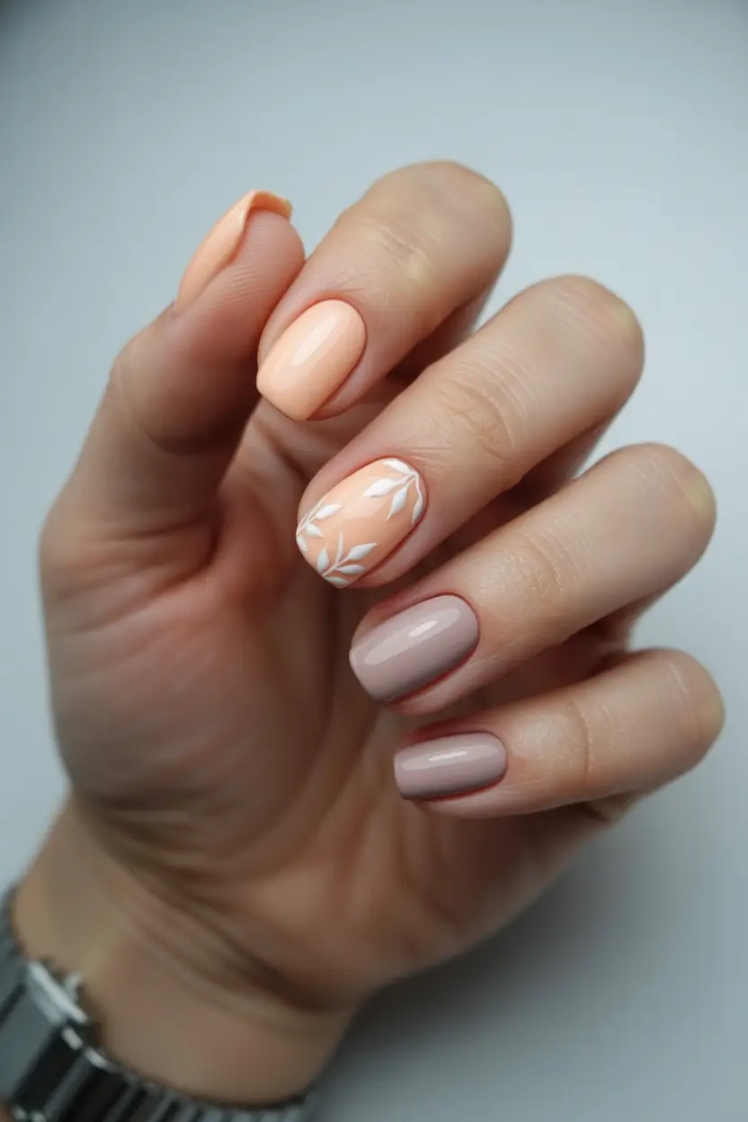 There’s something about peach-toned nails that instantly warms up the hands. This manicure leans into soft vacation simplicity: short square nails painted in creamy peach and neutral beige shades, accented by subtle white botanical detailing. The palette feels sunlit without being bright, which makes it perfect for anyone who wants cute spring nails without stepping too far outside their comfort zone.