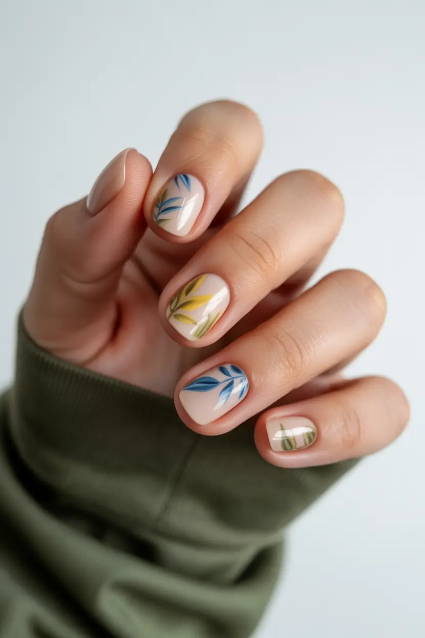 Now this is where spring vacation energy really shows up. Soft nude nails decorated with blue and yellow botanical elements feel cheerful without crossing into loud territory. The short length keeps the manicure practical, while the color accents bring a subtle beachy mood that works whether you’re traveling or just pretending you are.