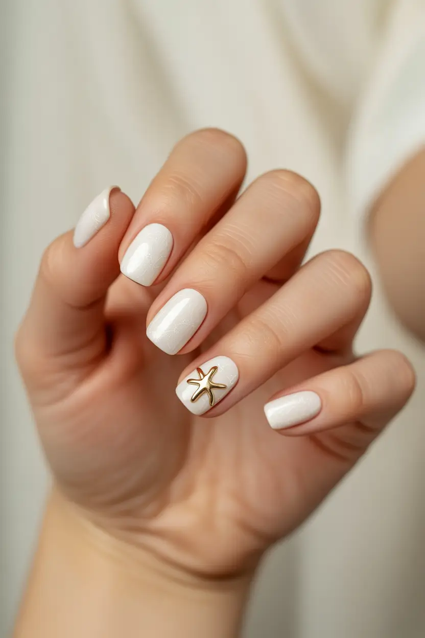 White Short Square Nails with a Coastal Star Detail