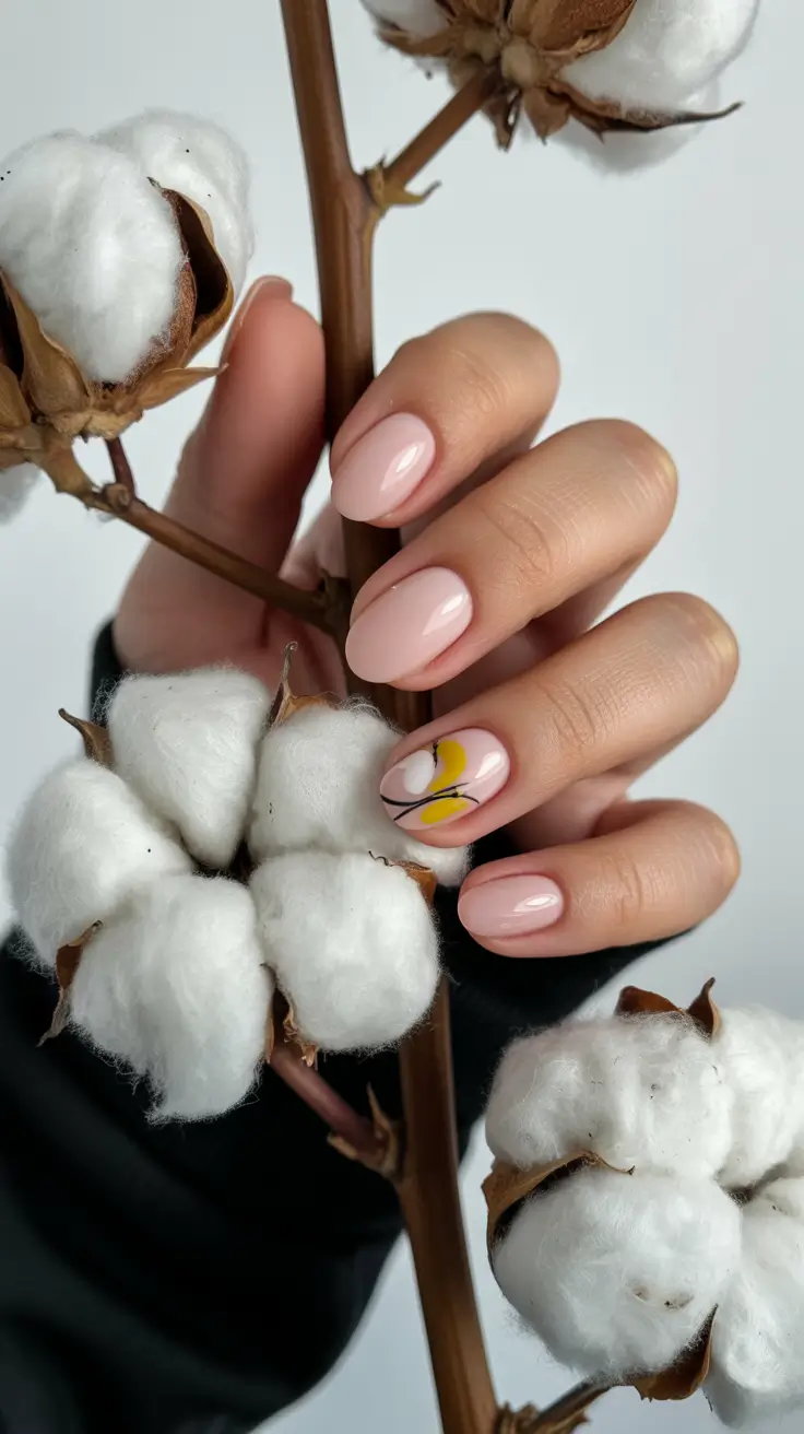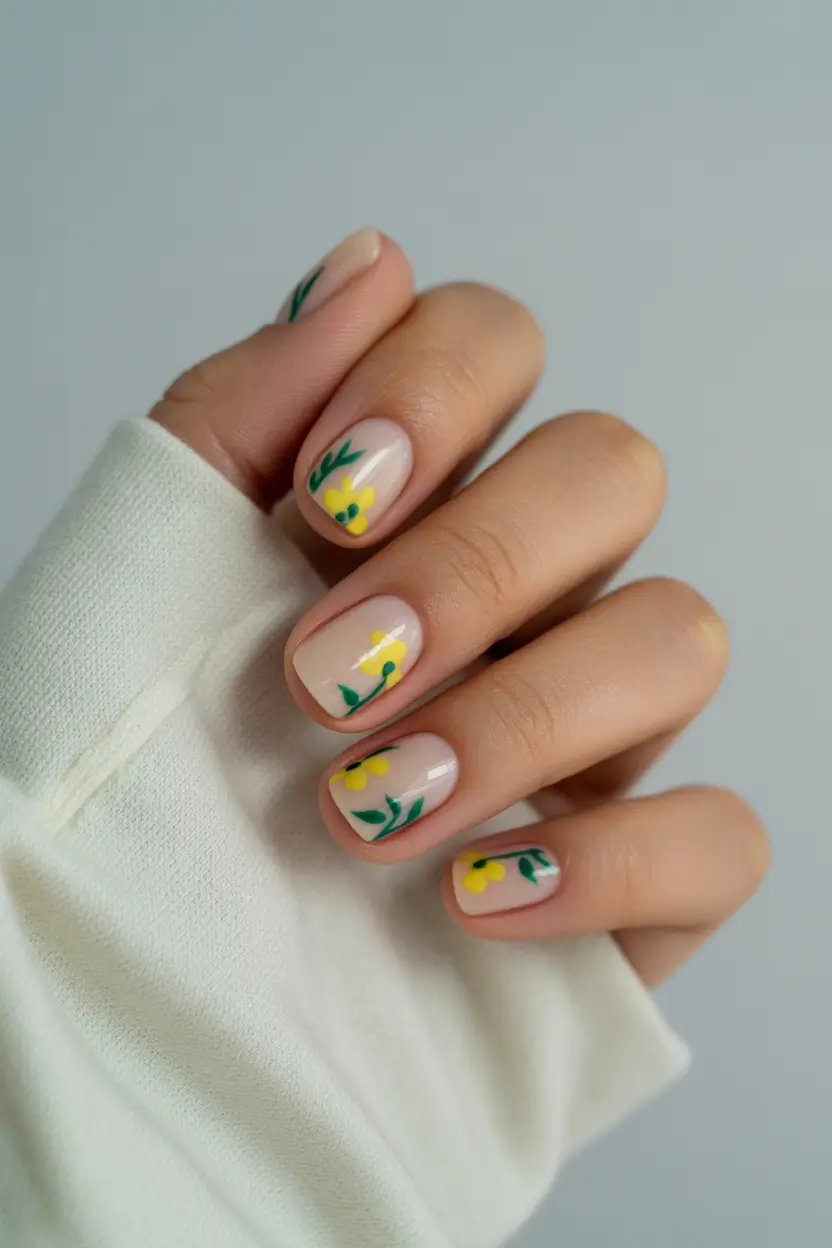 I usually choose neutral builder bases like The GelBottle BIAB in soft beige tones to create that smooth canvas. For flowers, pastel yellow gel polish and a micro-detail brush are enough – no complicated tools required.