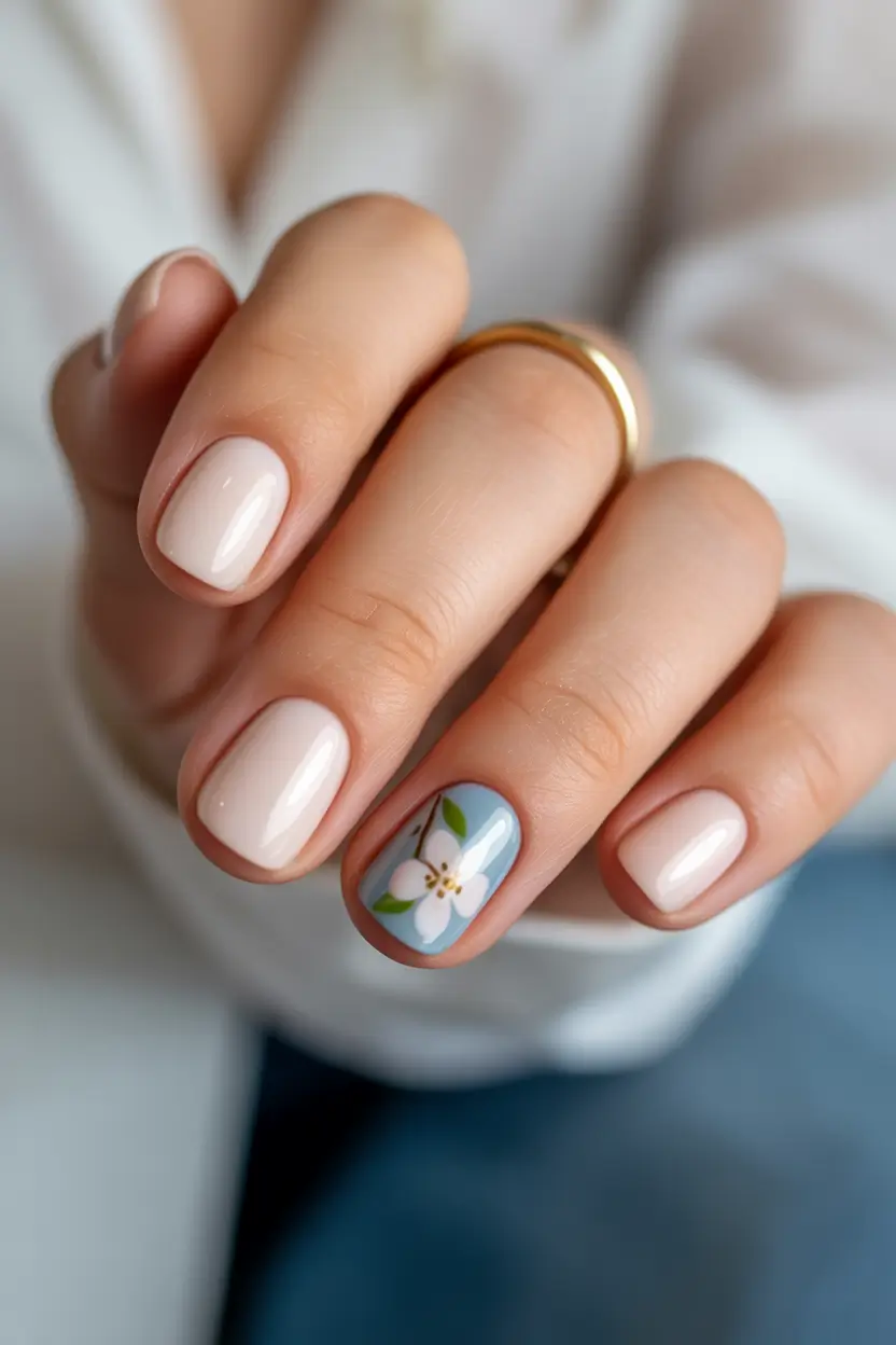 I keep coming back to designs like this when I want something cute but still effortless for a spring vacation. Short square nails coated in a creamy nude shade feel clean and timeless, while a single soft blue accent nail with a delicate white flower adds just enough personality. The balance between neutral and color makes the manicure look intentional without feeling overdone, which is exactly what I look for when packing light for a trip.