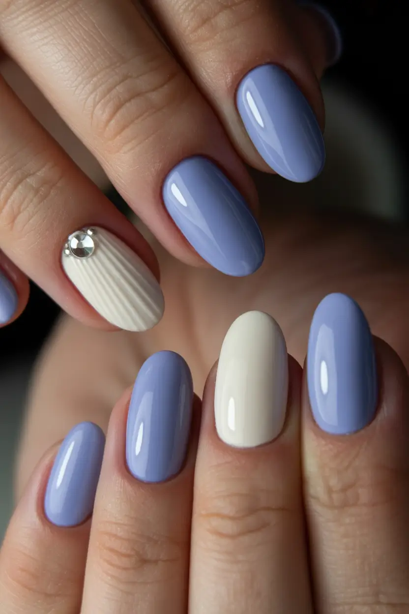 When I recreate something similar, I use shades like Gelish My One Blue Love paired with a creamy off-white builder gel for the accent nail. Creating texture can be surprisingly easy at home using a thin liner brush before curing the gel. Celebrity manicurists often say texture replaces heavy nail art in modern trends, and I completely agree after trying it myself.