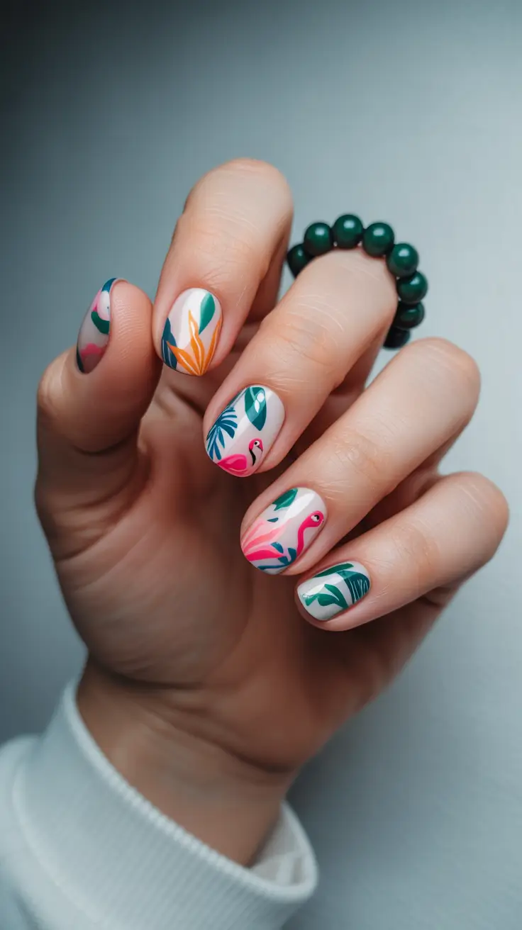 Creating this manicure requires a small palette of gel colors – think Bio Seaweed Gel tropical shades, vibrant greens, and flamingo pink tones. Detail brushes and dotting tools help achieve clean shapes, while a milky base keeps everything cohesive instead of chaotic.