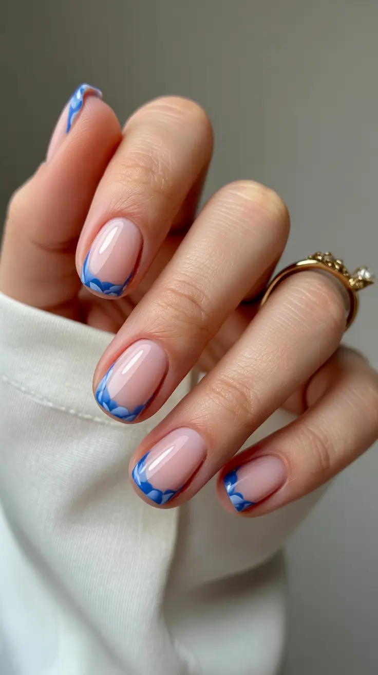 To recreate this look, I usually start with a milky nude like OPI Put It In Neutral and pair it with a pastel blue gel similar to Essie You Do Blue. A fine liner brush helps create soft petals rather than sharp shapes. I learned over time that floral accents look more modern when they feel slightly imperfect, almost hand-sketched instead of precise.