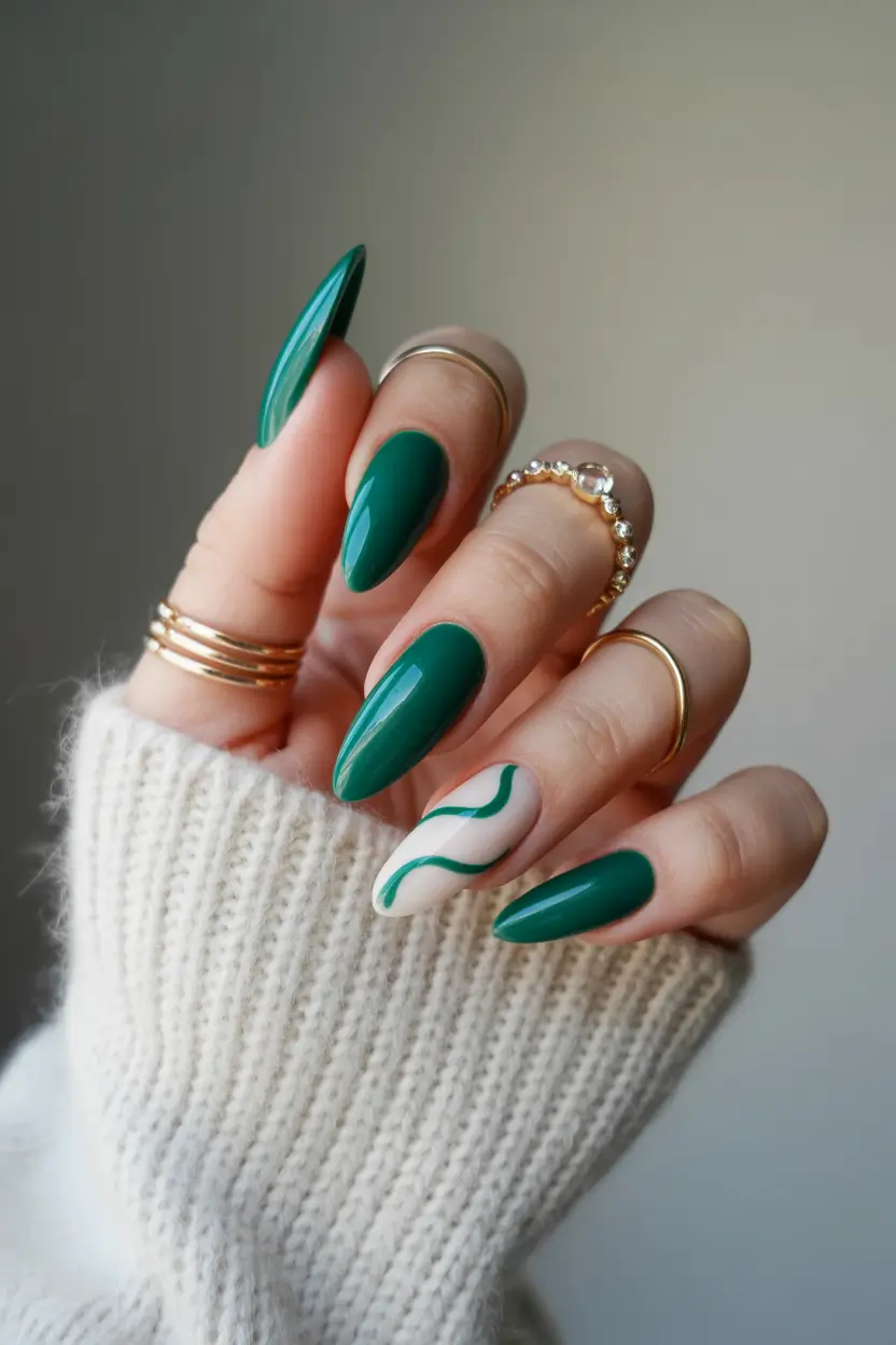 Deep Green Glossy Nails with Modern Accent Detail