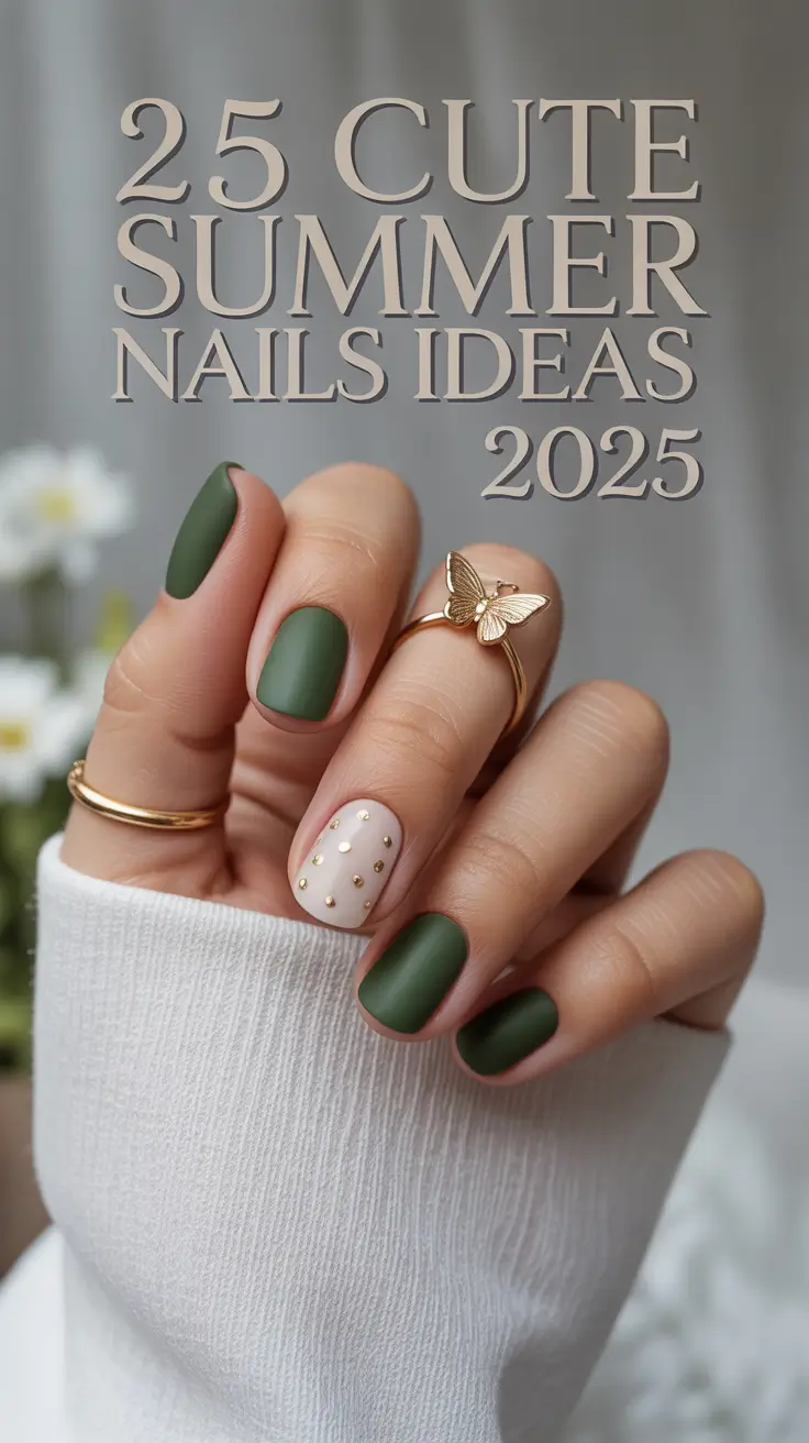 This set is living proof that short nails simple doesn’t mean boring. Matte forest green is the main star, with a cool tone and sophisticated look and it is joined by a few dot and wave details in warm brown and muted mustard. Because of its nude base and tiny metallic touches, the palette seems both natural and modern. It’s all about a calm picnic in the park, but with some extra class.