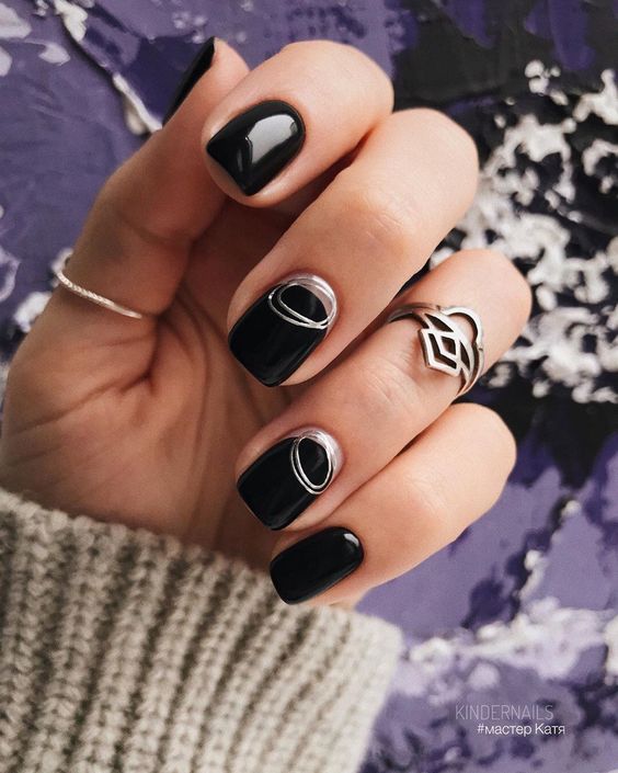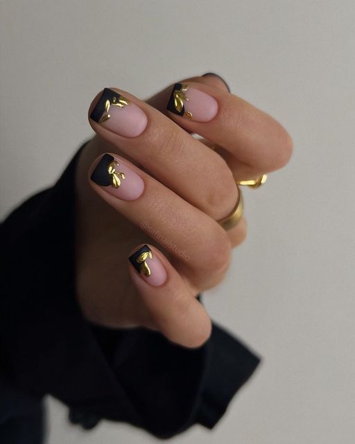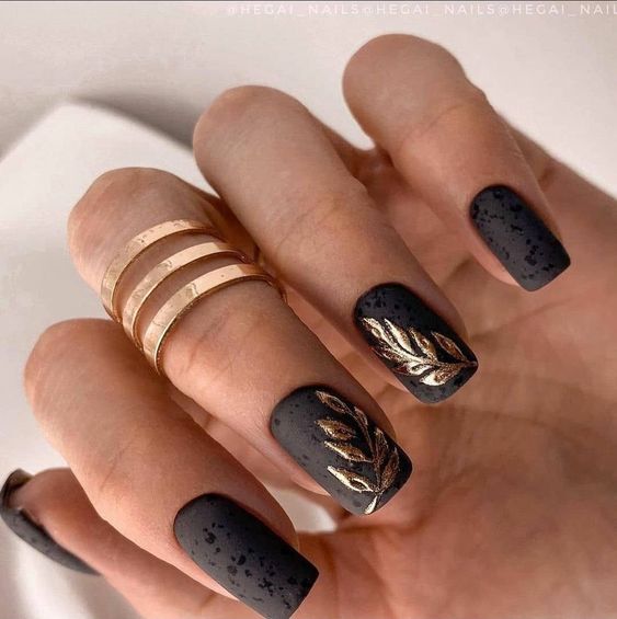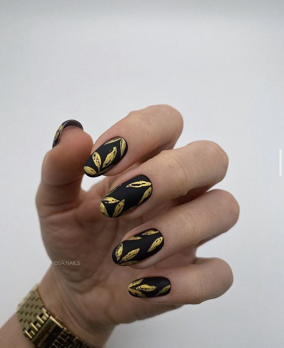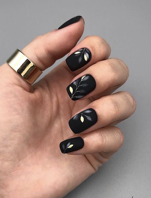 Invoke the spirit of nature with these understated black nails adorned with gold leaf patterns. The design is both cute and classy, providing a luxurious yet earthy vibe. The gold embellishments add an accent of sophistication, making these nails a great match for beach weddings or summer garden parties where you want to carry a piece of nature with you.