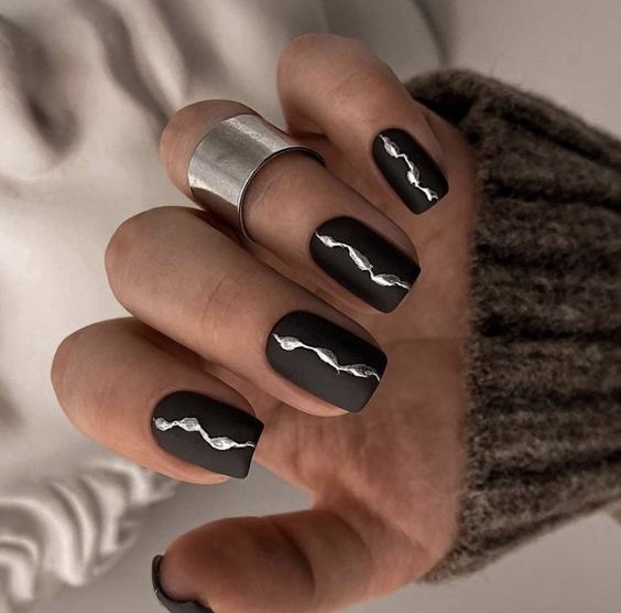 Channel the raw power of a summer storm with these matte black nails that feature electric white streaks, capturing the essence of lightning in a bottle—or in this case, on your nails. The trendy design is a sparkly homage to the unpredictable beauty of nature, ideal for those who carry a storm within them. Pair with silver or white accessories to echo the electric energy of your nails.