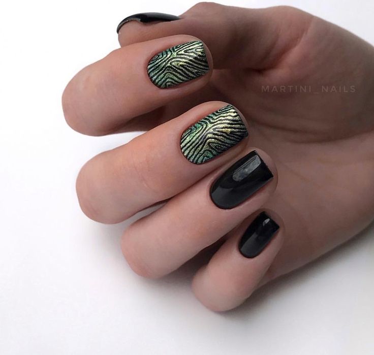 Black nails get a wild twist with this zebra stripe art. The green and black pattern is a nod to the untamed beauty of the savannah, making it a unique 2024 trend for nail designs. Ideal for the woman who carries a piece of the wild in her soul, these nails are a statement piece that pairs beautifully with simple black attire or an aesthetic green and black ensemble.