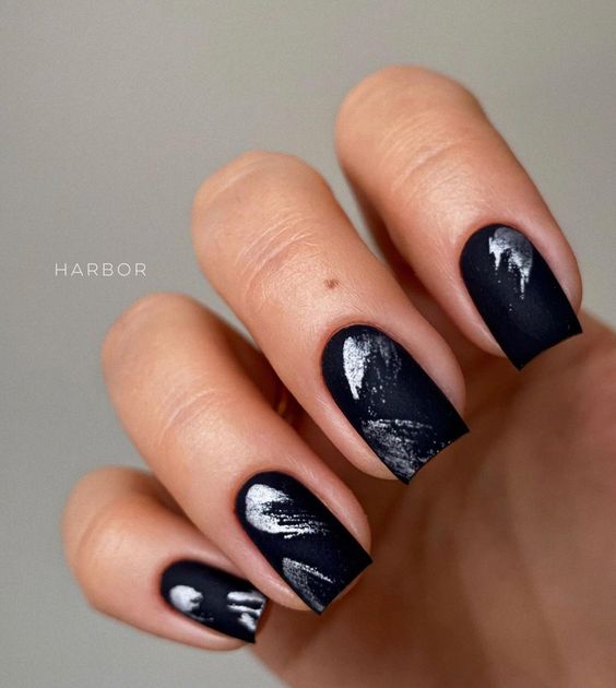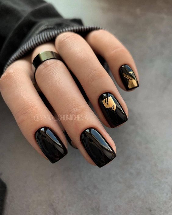 Embrace abstract art with these black nails that feature gold highlights in a creative splatter. They strike a balance between elegance and edginess, perfect for adding an artistic touch to any outfit. This design speaks to the aesthetic trendsetters, pairing well with minimalist jewelry and simple, classy looks that let the nails do all the talking.