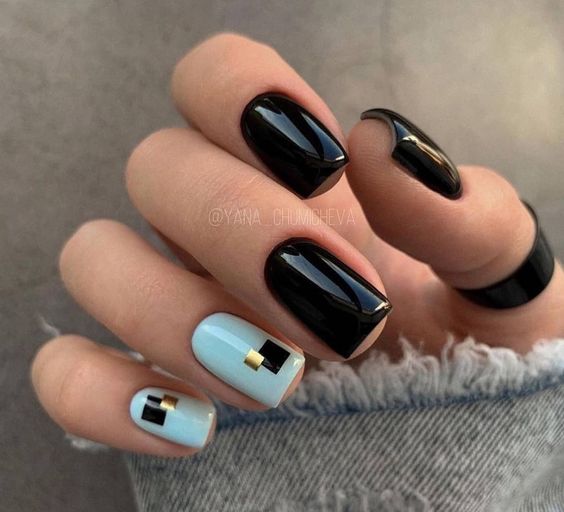Elegance meets modernity in this trendy design, blending the timeless appeal of black with soft pastel blue, punctuated with gold accents. This look is a summer staple for those who appreciate a pop of color amidst the classy black. The addition of geometric shapes with metallic details provides a luxurious touch to the overall simple design. Perfect for a breezy beach day or a casual outing, these nails will complement both sparkly accessories and matte textures in your wardrobe.