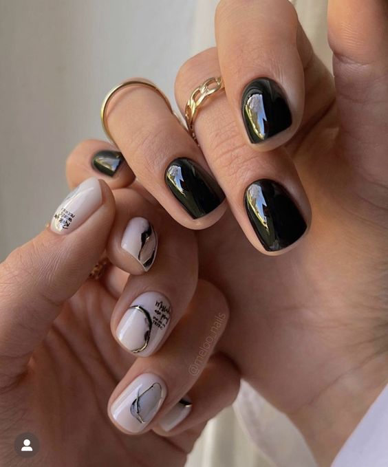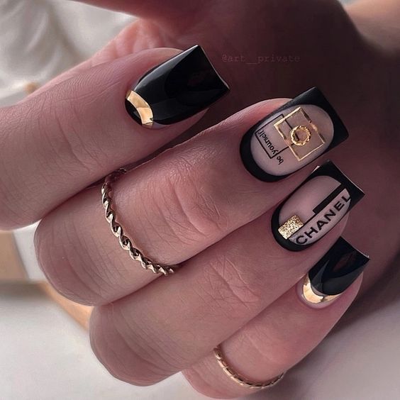 Immerse yourself in the world of haute couture with these black nails that serve as a tribute to iconic fashion houses. The gold accents and branded embellishments aren’t just nail art; they’re a fashion statement that declares your love for luxury. Each nail is a masterpiece, combining glossy and matte finishes with impeccable precision. Whether you’re attending a high-end event or simply adore a touch of glamour, these nails will complement a gold and black ensemble, making you the embodiment of sophistication.