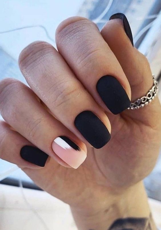 The allure of the midnight hour is captured in this matte black manicure, with a single pink and skin-toned accent nail. It’s a design that speaks to the elegance of simplicity, resonating with trendy minimalists. This understated look pairs beautifully with a sparkly evening gown or a simple white tee and jeans, making it a versatile choice for both beach lounging and city strutting.