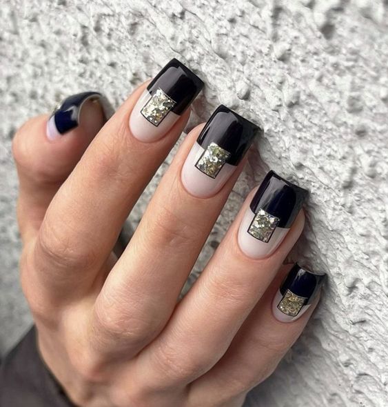 Here’s where glitter meets glam in a sophisticated manner. The timeless duo of black and white gets a luxurious uplift with a sweep of gold. The gold and black combination is not just a manicure; it’s a statement piece, an accent that demands attention. This design is for the bold, the ones who walk the line between classy and trendy. It’s perfect for a beach gala or an upscale summer event where your nails should speak as elegantly as your dress.