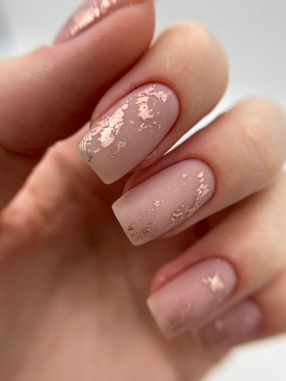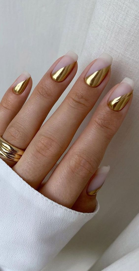 Metallics have made a grand entrance into the nude nails summer 2024 scene, infusing classy sophistication with a hint of futurism. These nails boast a gel-polished nude base and are crowned with a striking metallic gold at the tips, creating a sleek and modern French design. The almond shape adds an extra touch of trendy elegance, making it a perfect choice for the fashion-forward woman who wants to make a subtle yet impactful statement.