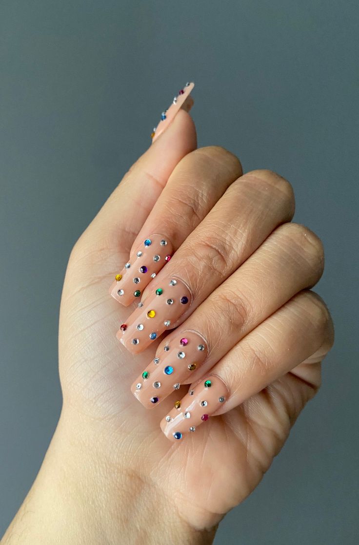 Bold and playful, these nude nails are a canvas for a kaleidoscope of colorful rhinestones, perfect for those who view their nails as a form of expressive art. This design is an eclectic mix of color and sparkle, embodying the vibrancy of summer. Each stone catches the light differently, ensuring that your nails will be the life of any party or social gathering. It’s a design that’s as cute as it is trendy, reflecting a joyous 2024 short nail inspo.