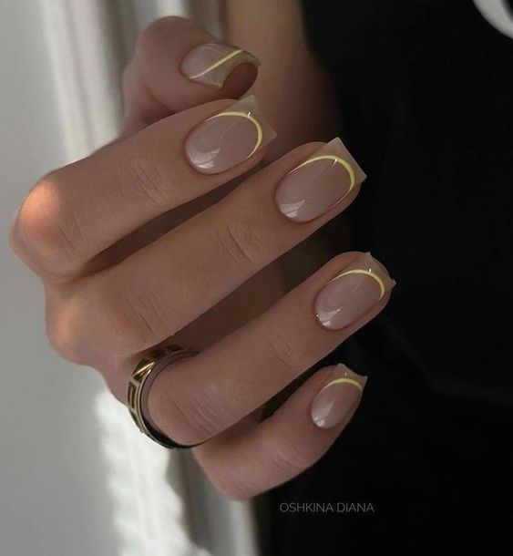 This design is for the minimalist who delights in clean lines and understated beauty. The nude base of these short nails is complemented by a single, thin yellow line at the tip, creating a modern twist on the classic French manicure. It’s simple, it’s chic, and it’s utterly trendy. This design is an ideal choice for the woman who commands a room with her quiet confidence and unspoken style.
