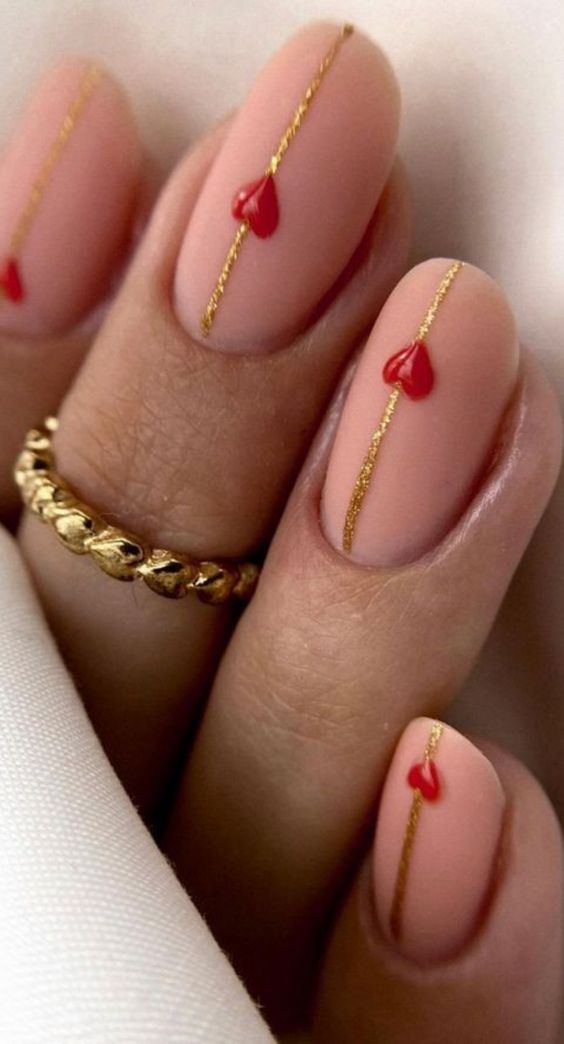 Echoing the tender sentiments of summer, these nude nails present a perfect fusion of simple charm and delicate design. A thin, golden line bisects each nail, leading to a small, glossy red heart—a symbol of love’s precision and the joy of the holiday season. It’s a trendy choice for the romantic at heart, blending the warmth of gold with the passion of red on a nude canvas, ideal for those who prefer their statements pretty and poetic.