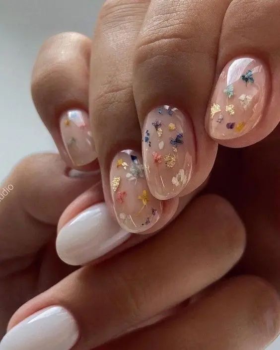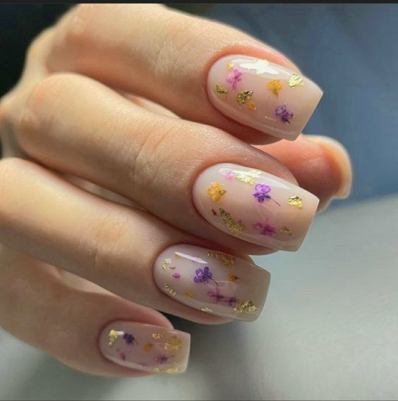 Summer’s dreamy side comes alive with these nude nails sprinkled with lavender flowers and gold flakes, reminiscent of a holiday in Provence. This design provides a subtle splash of color and art, ideal for those who seek a hint of nature in their look. It’s a pretty, simple expression of summer’s floral inspo, combining trendy elements with timeless classy appeal.