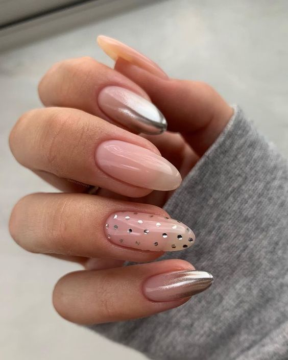These nails marry playfulness with sophistication, showcasing polka dots alongside metallic stripes on a nude base. It’s a design that’s both cute and classy, with a touch of whimsy that’s perfect for 2024’s trendy styles. The pretty combination of matte and shine creates a textural contrast that’s bound to draw the eye and complement any summer ensemble.