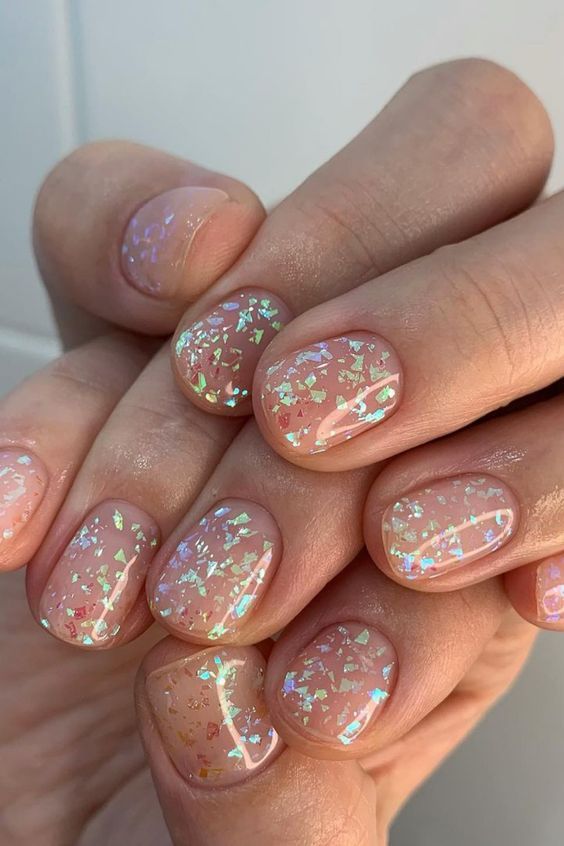 Channeling the playful spirit of summer, this nail design is a celebration on the nails. Shimmering flecks of iridescent chrome dance on a nude backdrop, catching the light and the eye. They are reminiscent of the inspo taken from childhood confetti and are perfect for those who want to add a dash of whimsy to their 2024 wardrobe. The gel overlay not only adds dimension but also ensures these designs short nails stay pretty through all the summer festivities.