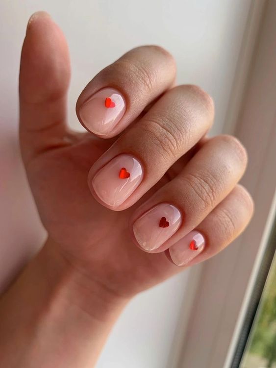 Embracing the trendy spirit of 2024, these nails feature whimsical tiny hearts that appear to float on a nude canvas. The short length keeps the look simple and understated, while the pop of red adds a dash of charm. This design speaks to those who find joy in the small details, offering a cute nod to the inspo found in everyday happiness. It’s a pretty, inspiring choice for anyone who carries a light heart and a warm smile.