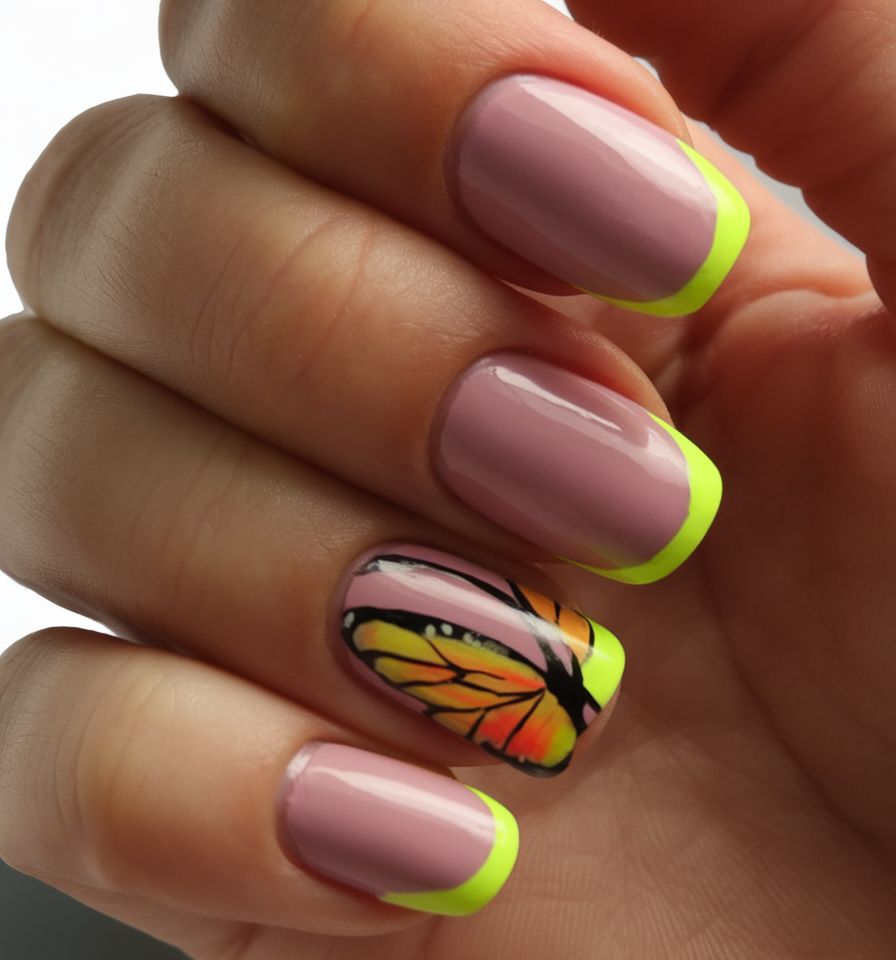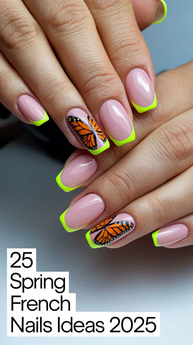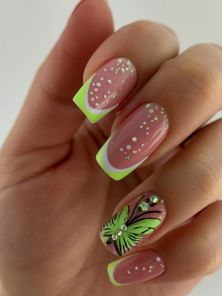A playful take on spring French nails ideas 2025, this square manicure combines a pink base with bold yellow French tips. Hand-painted butterfly art in matching neon green tones adds an artistic element, while tiny pearl embellishments provide a shimmering effect. This design is ideal for those who love vibrant, nature-inspired nail looks.