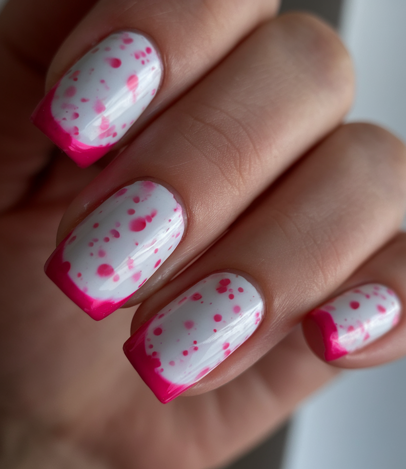 This square French manicure introduces a unique take on classic white nails by incorporating a pink splatter effect. The vivid red and pink droplets across the nail bed add a creative, abstract twist, blending fun with minimalism. A glossy gel finish ensures a smooth and modern design, making it a trendy choice for March and beyond.