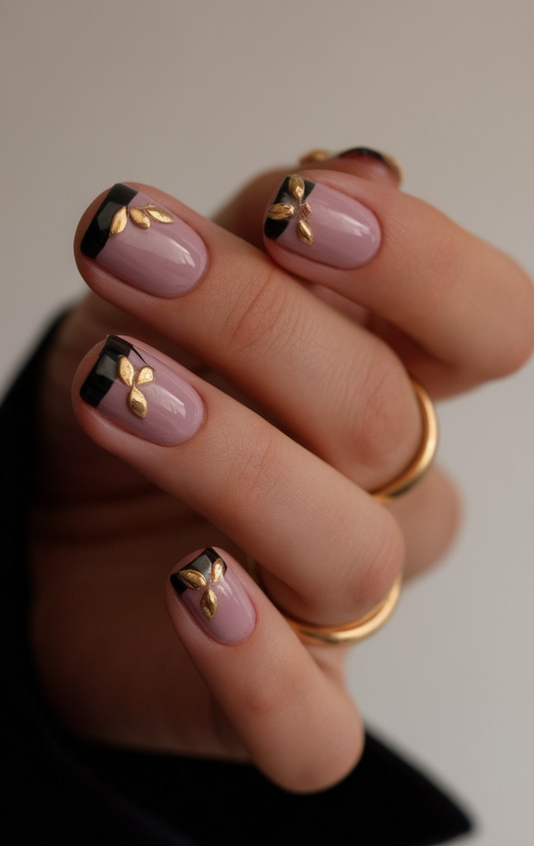 This short oval French manicure blends soft brown tones with bold black tips for a modern yet sophisticated look. The delicate gold leaf embellishments add a touch of elegance, making this design perfect for those who love minimalist glam. The smooth gel finish enhances the depth of color, ensuring a polished and refined appearance.