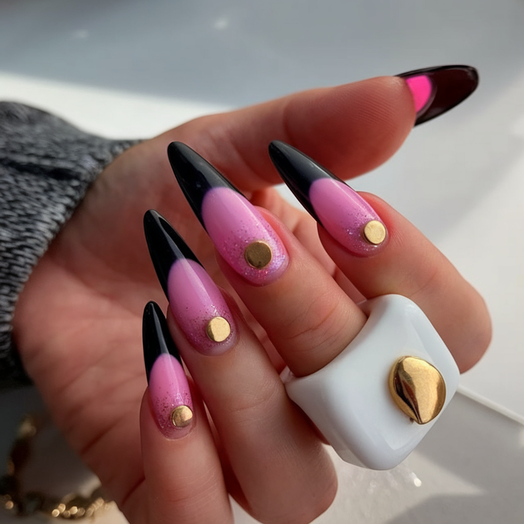 #11 Bold Almond Ombre with Black Tips and Gold Studs